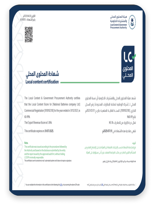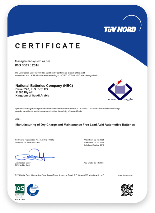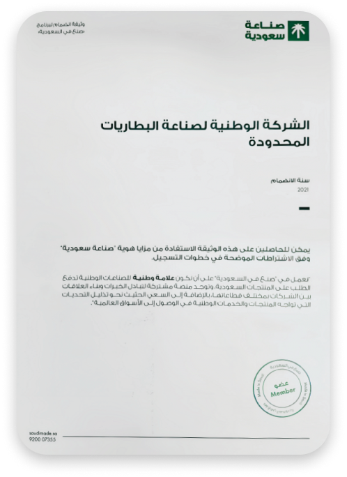 الشركة الوطنية لصناعة البطاريات هي شركة رائدة في سوق صناعة البطاريات، حيث تسعى لتحويل منتجاتها إلى منتجات فريدة تلبي احتياجات ورغبات العملاء. منذ تأسيسها في عام 1995، نجحت الشركة في تطوير وتسويق العديد من البـــطاريات عالية الجــــودة في مختلـــف البلــــدان والمناطق. تفخر الشركة بثقة ورضا عملائها، وقد حصلت على عدة جوائز مرموقة في الصناعة. تلتزم الشركة بتقديم أفــــضــل الحــــلول لعملائها، مع ضمان الجودة. تسعى الشركة لمواكبة رؤية 2030 وتميز الصناعة السعودية.